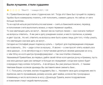 " то їх карткою не можна розплатитися в магазині-зняти в банкоматі можна, переклад і поповнення рахунку виконати можна, а через термінал помилка... то вони квитанцію дати не можуть... дзвонив їм на гарячу лінію — вони спочатку вимагають на питання відповісти... я їм вже і дату народження сказав, І місце прописки, і розмір і колір трусів... але ні, відповісти на питання мені було потрібно лише для того, щоб дізнатися, що квитанцію вони мені дати не можуть...", - поскаржився Користувач.
