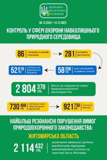 Житомирская область в центре внимания: 2 млн 114 тыс. 432 грн за засор земельного участка производственными отходами камнеобработки (пульпа) на территории города Житомира. Материалы направлены в Житомирскую областную прокуратуру.